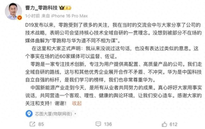 10月30日,针对近日不实传言,零跑科技高级副总裁曹力在其微博上发文表示。零跑D19发布会的交流会中与大家分享了公司的技术战略,表明公司会坚持核心技术全域自研的一贯理念。没想到被部分不在场的媒体曲解为“零跑称与华为道不同不相为谋”。