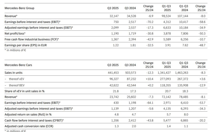 10月29日,德国汽车制造商梅赛德斯-奔驰集团公布三季度业绩。财报显示,2025年三季度梅赛德斯-奔驰集团销售收入为321.47亿欧元,同期为345.28亿欧元,同比下滑6.9%;营业利润为7.50亿欧元,同期为25.17亿欧元,同比下滑70.2%;调整后息税前净利润为20.99亿欧元,同期为25.37亿欧元,同比下滑17.3%;税后净利润仅为11.90亿欧元,同期为17.19亿欧元,同比下滑30.8%。