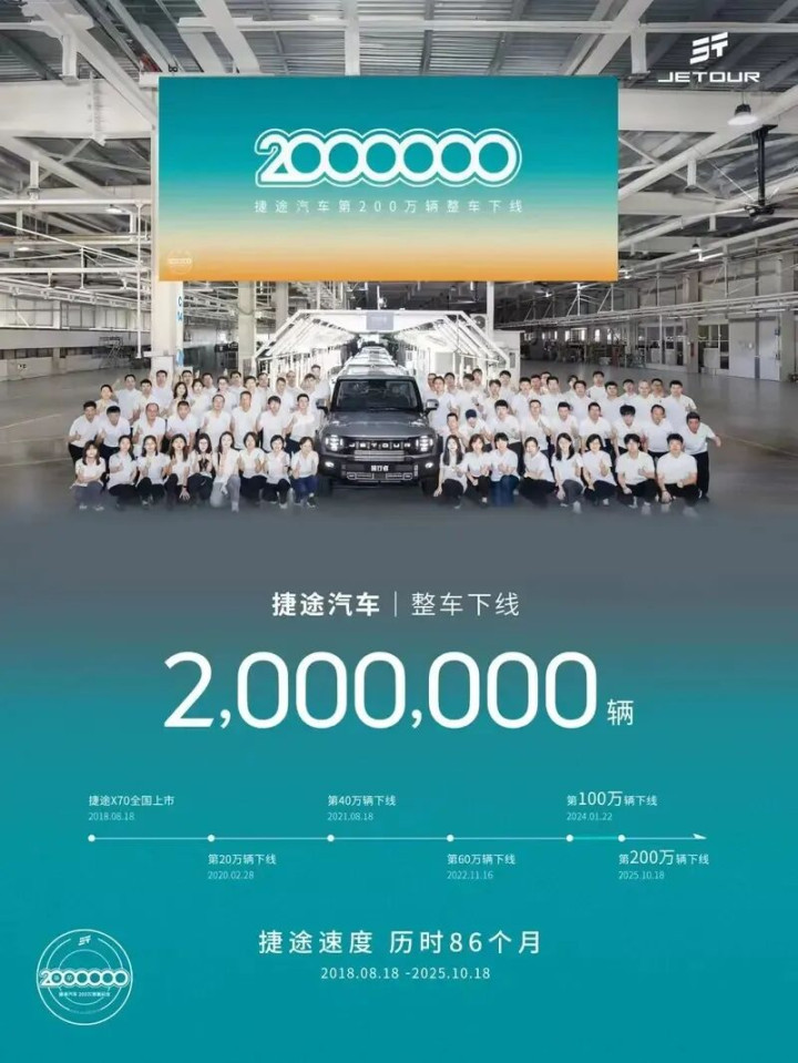 日前,捷途汽车官方宣布捷途汽车迎来第200万辆整车下线。官方表示,从2018年8月18日捷途X70 全国上市至今86个月,捷途汽车完成了200万辆整车下线。